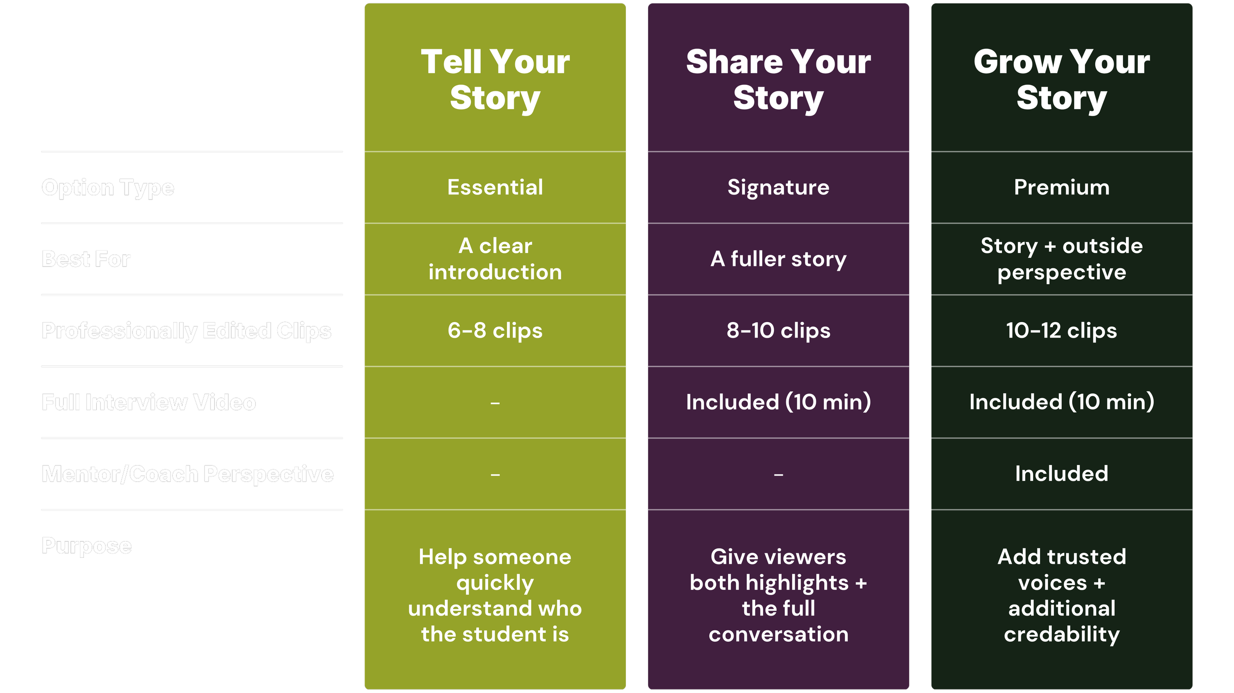 Each Spotlight option begins with a professionally guided conversation and results in edited video assets that help your student be clearly understood, shared, and remembered.